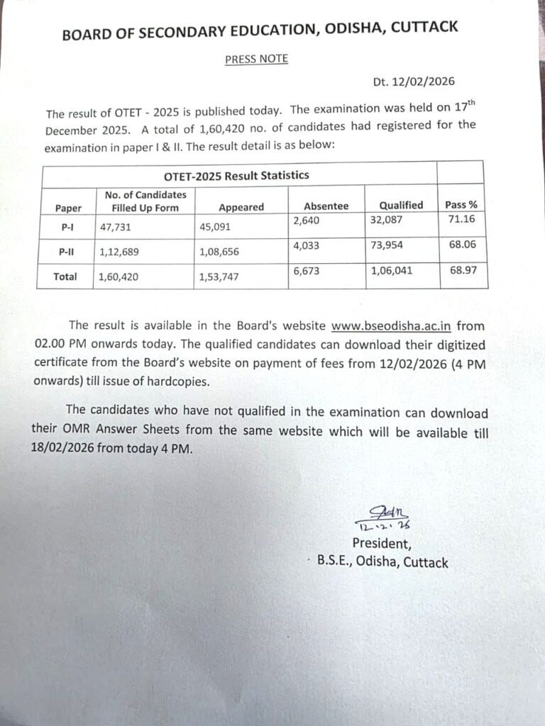 The OTET 2025 Result has been declared today, 12 February 2026, by the Board of Secondary Education, Odisha. Candidates who appeared for the OTET examination held on 17 December 2025 can now check their results online, download their scorecards, and access qualifying certificates.